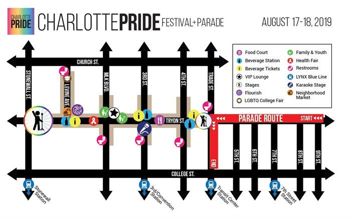 The Charlotte Pride Parade, the largest parade in the city, takes place Sunday, Aug. 18 from 1-3 p.m. The parade route travels along North Tryon Street from Ninth Street to Trade Street.