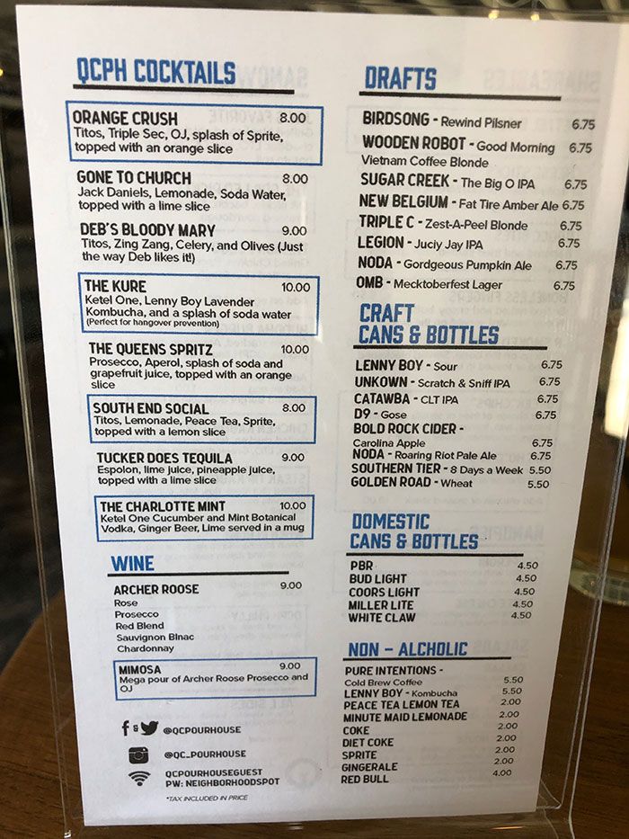 Here are the full QC Pour House food and drink menus:
