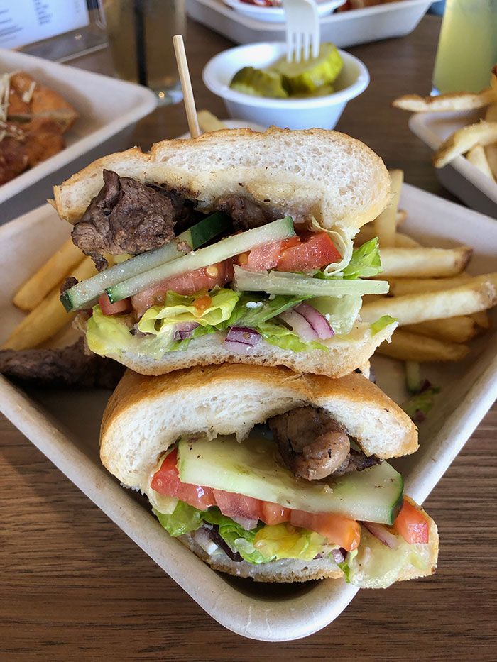 - Steak tip kabob sub ($13.50) – Grilled filet steak tips, feta, cucumber, kalamata olives, LTO, Greek dressing on a sub roll
