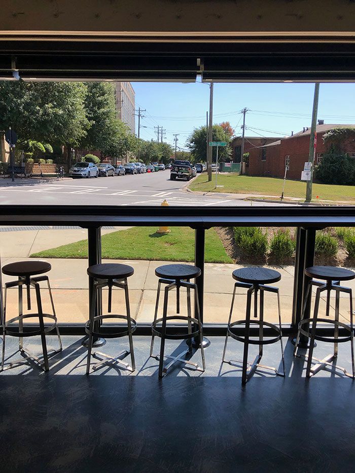 Bar seating along a wall of open windows overlooking Tremont also creates an airy indoor/outdoor atmosphere in the absence of a patio.