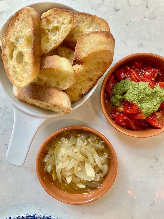 - Bruschetta Bar ($4) – Served deconstructed for tableside assembly in your choice of: pisello (fresh pea, shallot, robiolina), pollo (pulled rotisserie chicken, salsa verde aioli), pomodoro (olive oil cured tomatoes, basil pesto), baccala (salted cod, lemon aioli), lily confit (shallots, garlic, olive oil), peperoncino (roasted red pepper, pecorino), cariofo (artichoke salad, fresh mint, asiago, lemon), ricotta (ricotta, olive oil).