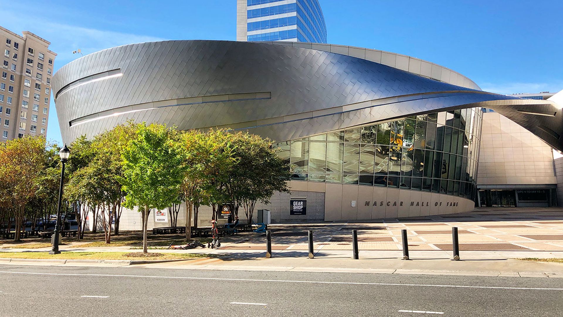 That night, the streak was the NASCAR Hall of Fame building, large-paneled windows wrapped around a bunch of old race cars.