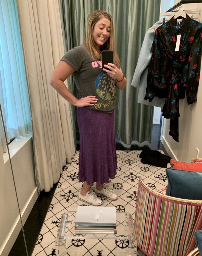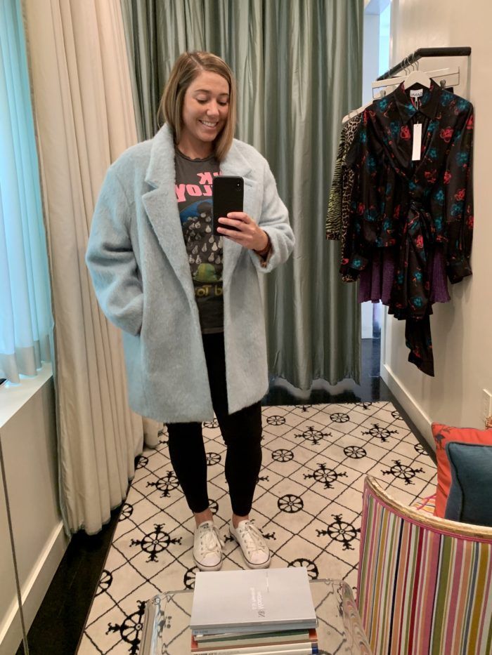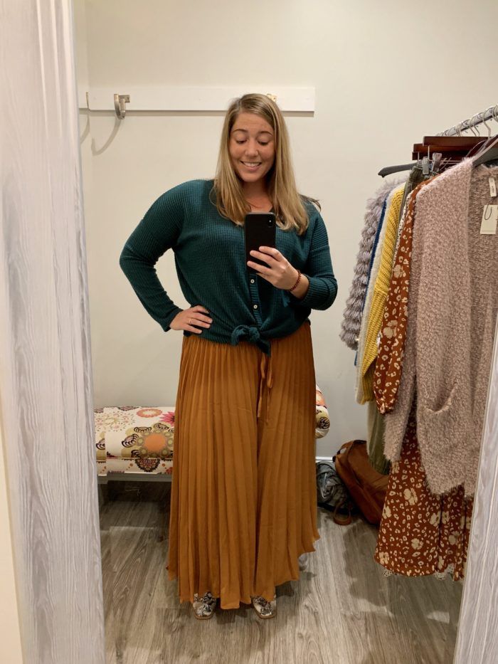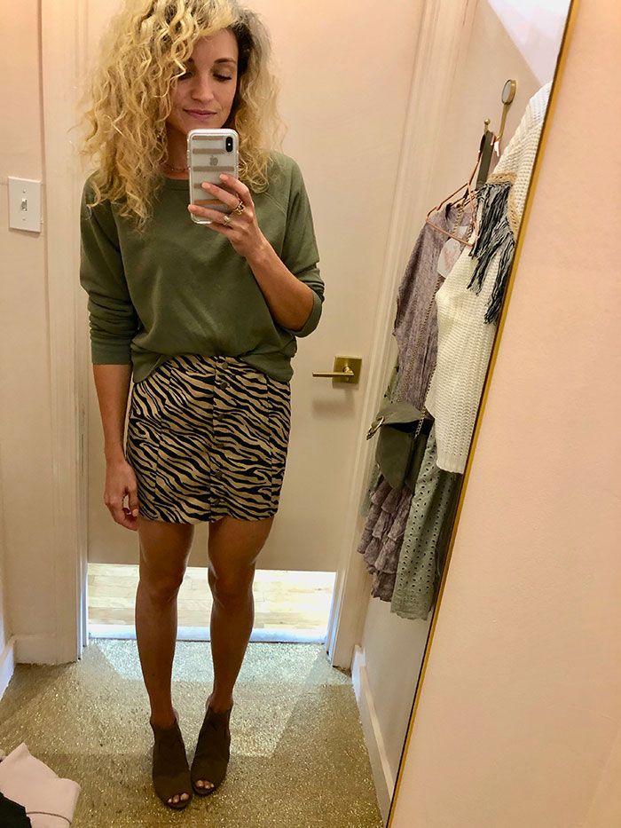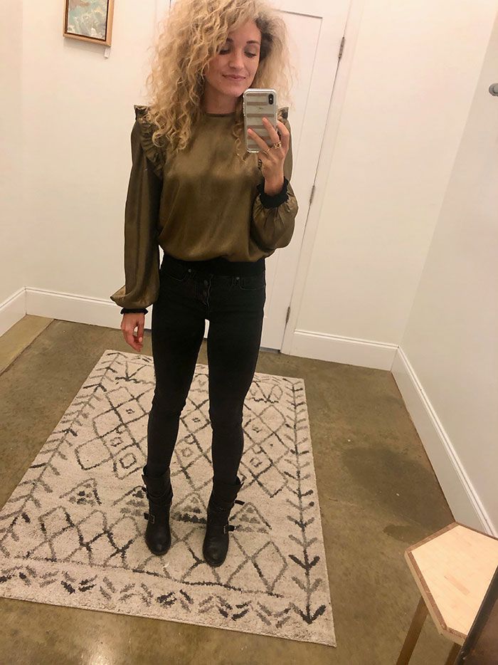 Here’s how it comes together: Katie pores over runway reviews to see which trends are big for fall (according to actual fashion editors), texts a condensed list of trends to Mary, and then we drive around to local boutiques to see how that’s translating as everyday wear in a city that’s not exactly on the map as a major fashion hub.