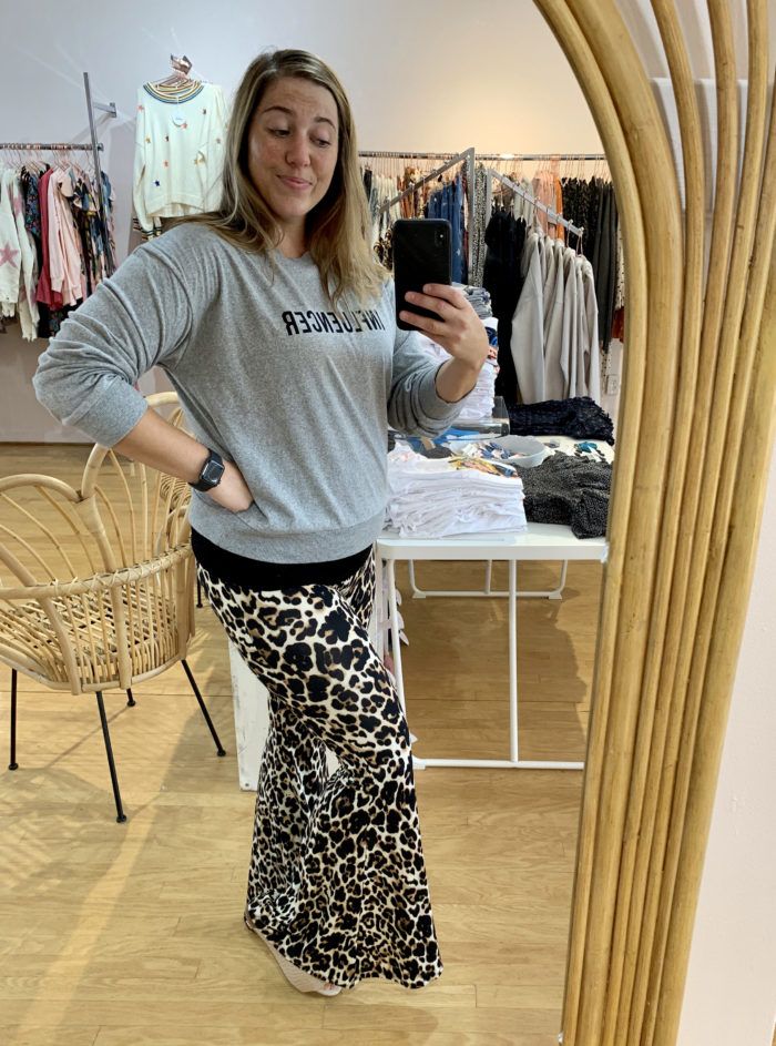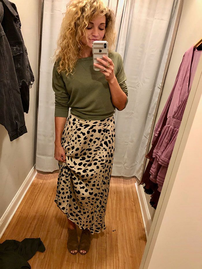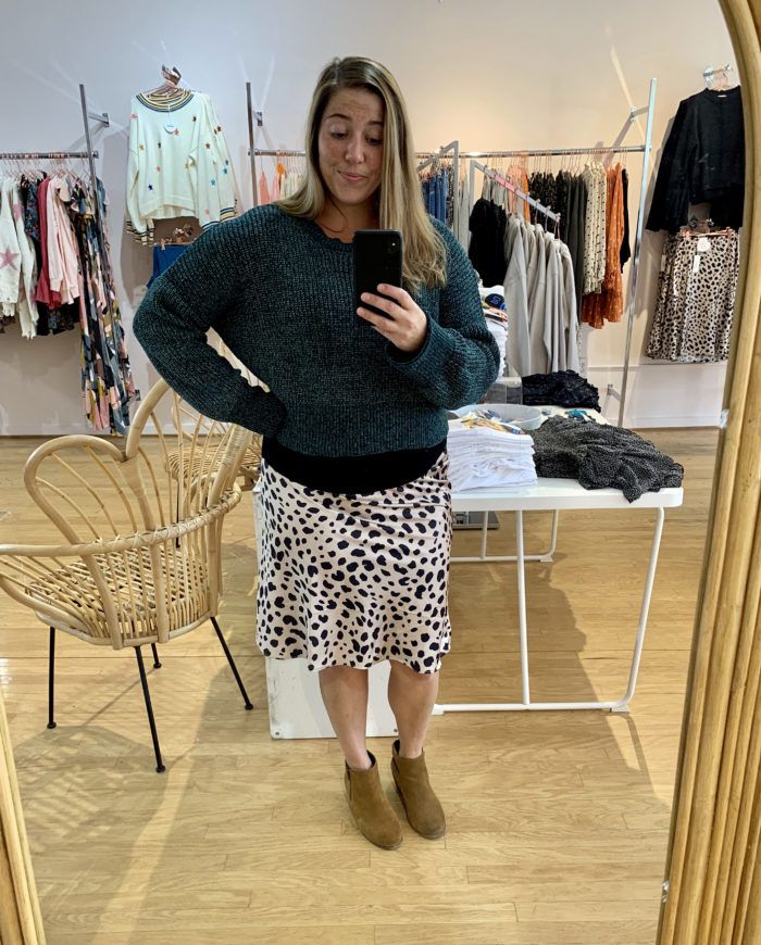 Astoria sweater, $52 and Leopard Lady skirt, $38 at Girl Tribe
