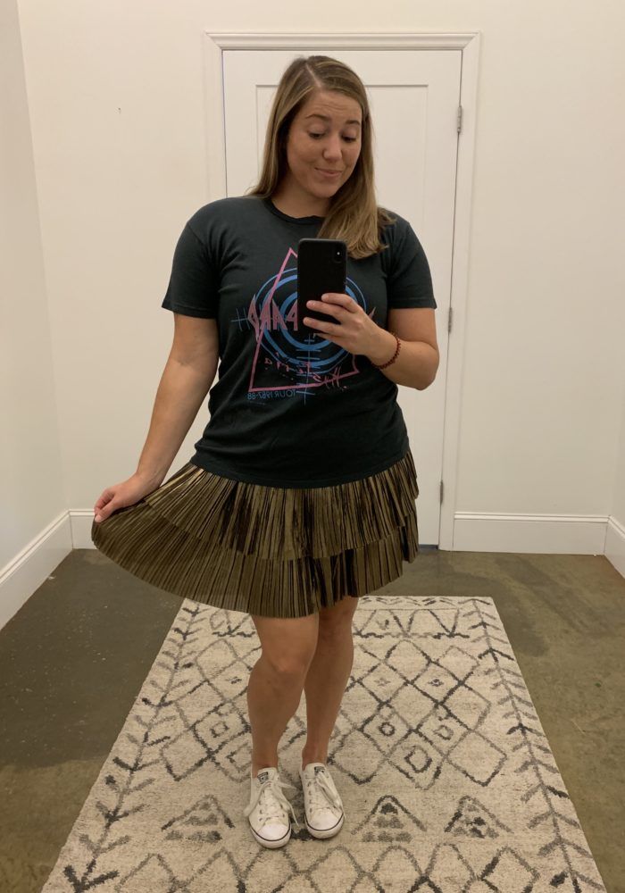Current Air gold skirt, $108 and Hysteria Tour Weekend tee, $70 at Boem
