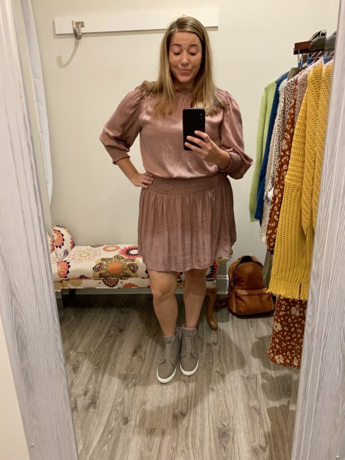 Mustard Seed dress, $44.99 and Julie wedge sneaker, $39.99 at Julie’s
