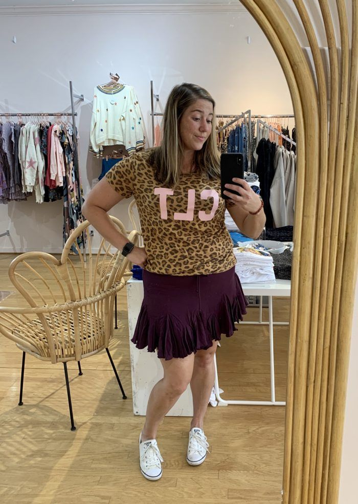 Monica skirt, $52 and CLT Leopard tee, $38 at Girl Tribe