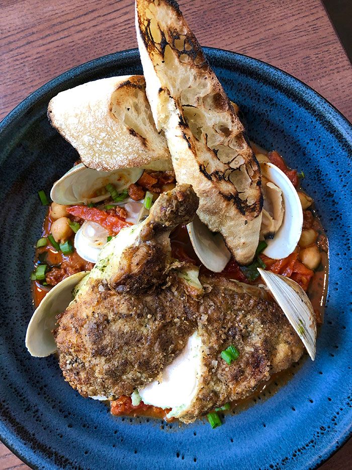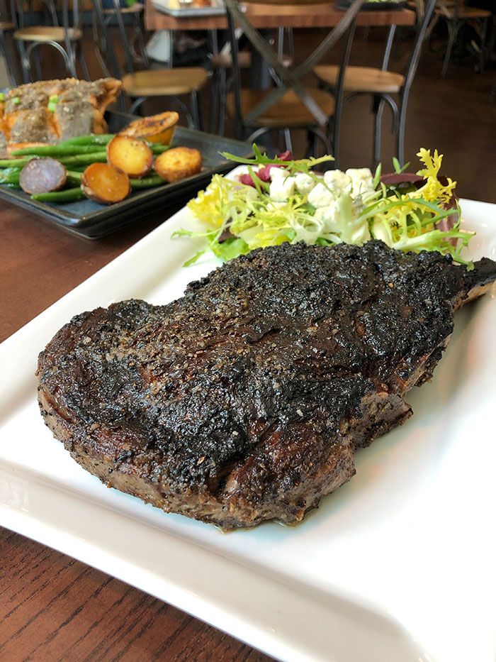 Dinner is an extensive offering of more than a dozen shareable small plates (priced $8-$14) and full entrees like Tomahawk bone-in ribeye ($72), crispy flounder ($38) and a house burger topped with a sunny side egg ($14).