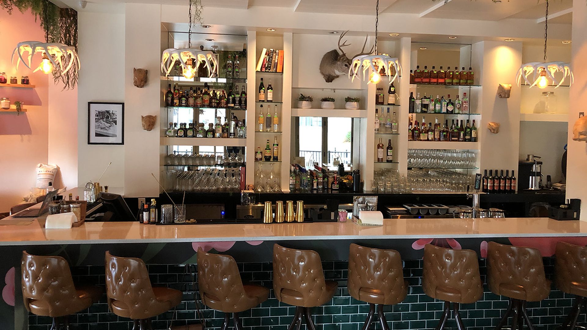 The design: The restaurant’s design is in-your-face and funky. The bold, floral wallpaper you’ll notice immediately upon walking in pays tribute to traditional Mexican dresses, called huipils, noted Lomeli. The jungle-inspired art, including the deer, pheasant, and jaguar wallpaper and the horned light fixtures, reflect animals that are prominent in the region where Lomeli’s family is from. The space itself is 1,900-square-feet with a small patio outside.