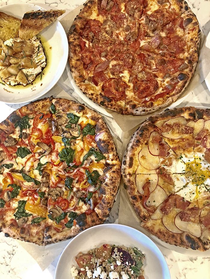 The full-service Italian restaurant occupies a 3,100-square-foot space with floor-to-ceiling windows and a bustling bar and dining room up front. The back dining room is quieter and features an eight-seat pizza bar with a view of the open fireplace and approximately 35 banquette seats lining both walls.