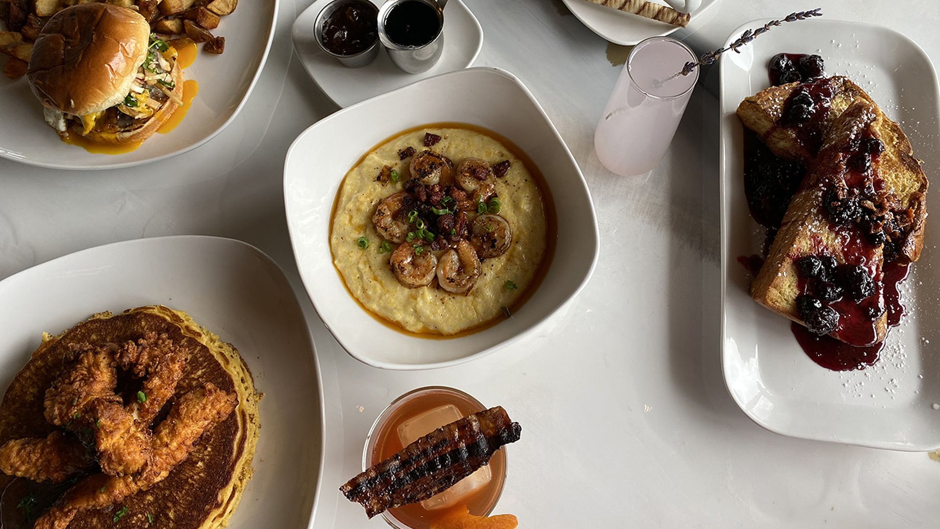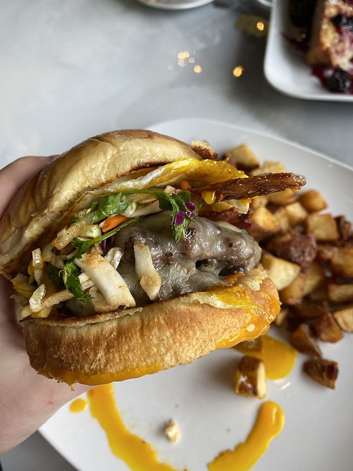 Must-try dishes include a ricotta-stuffed French toast ($11.95) with a berry compote and crumbled bacon. And shrimp and cheddar grits ($13.25) served with Portuguese sausage and a kick of Cajun seasoning. Plus, the restaurant’s brunch burger ($11.95) could help even the worst hangover with two patties topped with apple slaw, candied bacon, white cheddar, and a chipotle aioli.