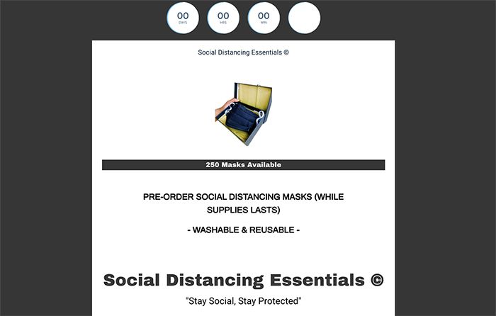 At the very top of Social Distancing Essentials’ website is a countdown that starts at 15 minutes and continues down to 0:00. There’s a sense of urgency, as if you must buy the mask now or it’ll be gone.