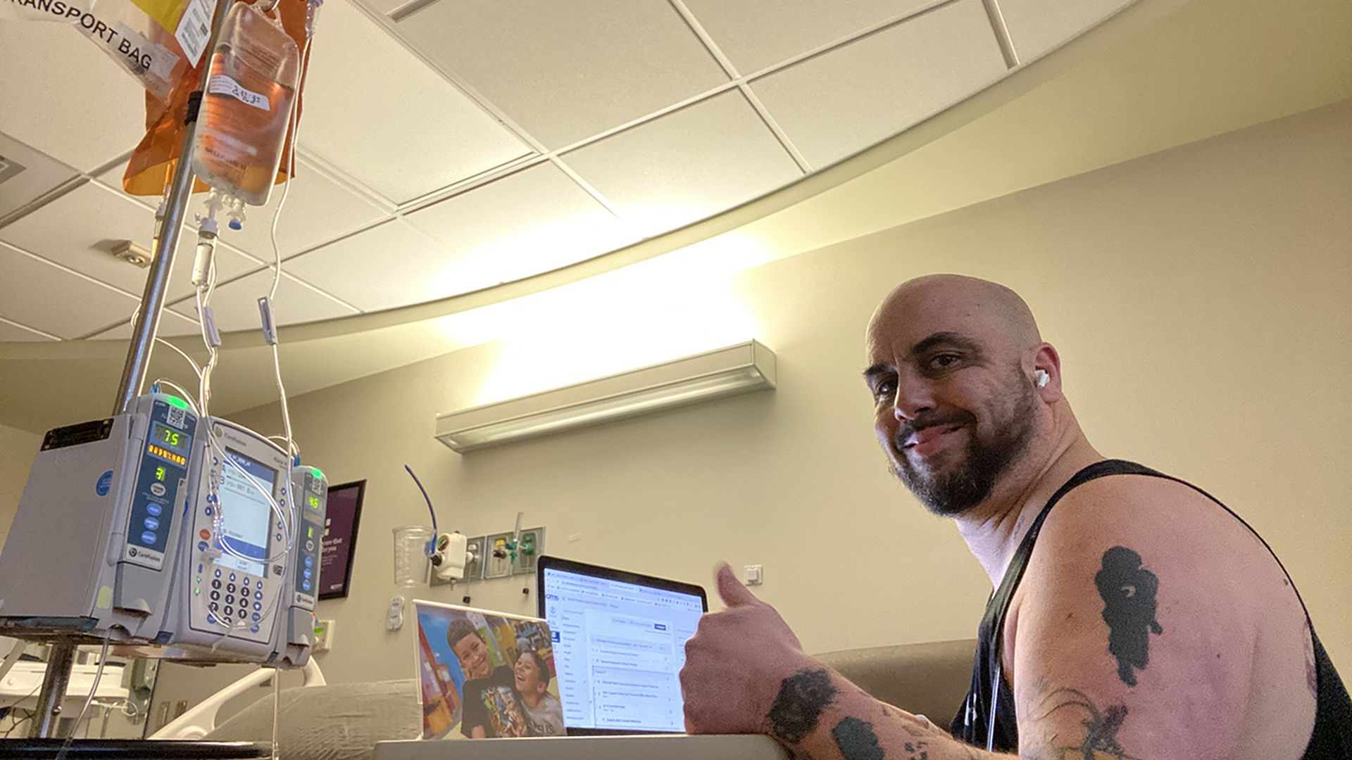 Loesel’s chemo treatments require five-day hospital stays, which he has to spend alone due to COVID-related visitor restrictions.