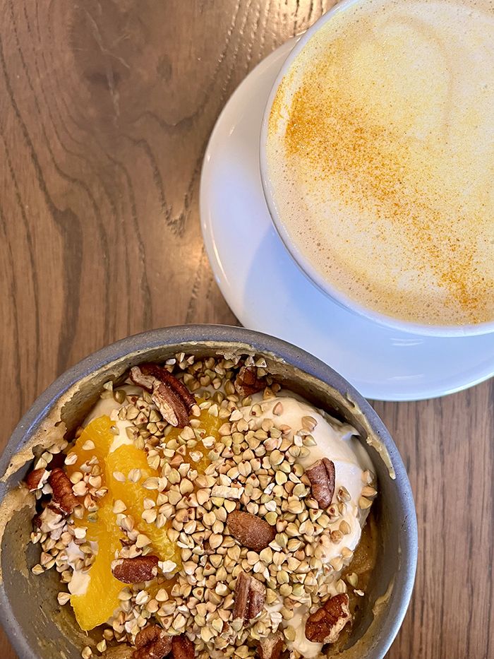 Go-to order: Sunrise Yogurt bowl with orange zest, turmeric coconut cream, orange slices, buckwheat groats and pecans.