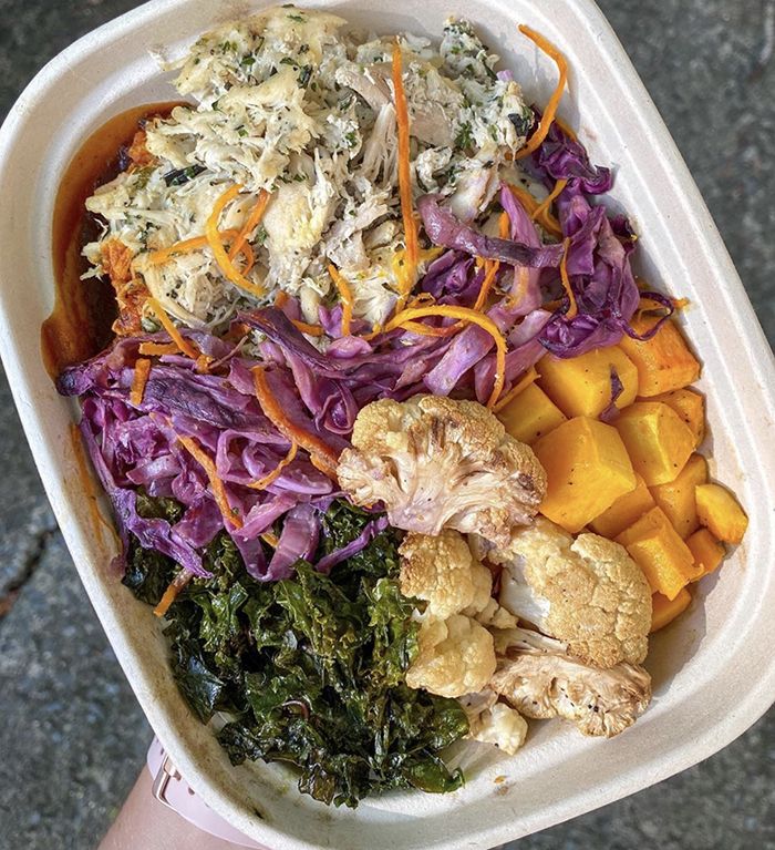 Meal service offering delivery and pickup with options to order by the item, pack, pound, and box