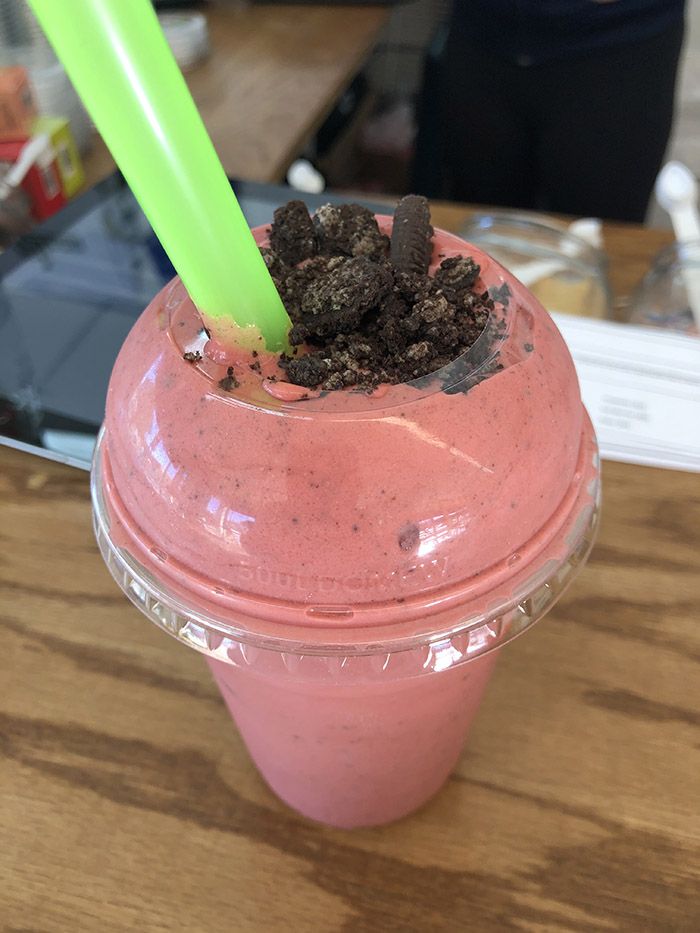 Go-to order: Sir Purr smoothie (banana, cinnamon, cacao powder, blue manic, and almond milk)