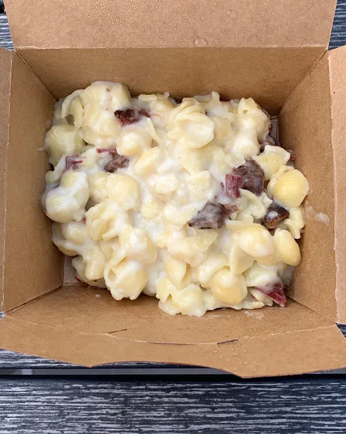 - Brisket mac & cheese ($7) – shell pasta with creamy cheddar and hickory smoked brisket