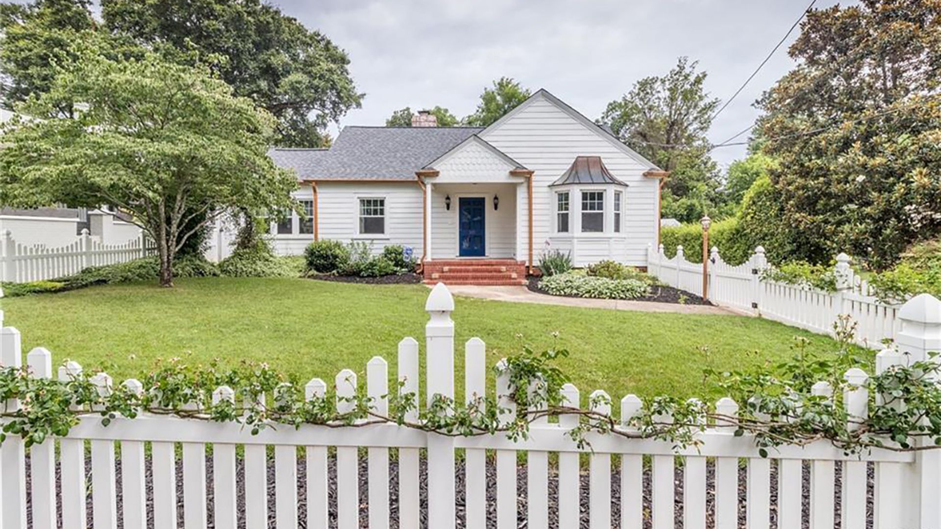Why we love it: This one-story 1940s three-bed is as charming as it gets. I love the white picket fence front yard and the patina on the copper pipes/accents. The white kitchen with updated pulls, wallpaper powder room, and upgraded bathrooms also won me over.