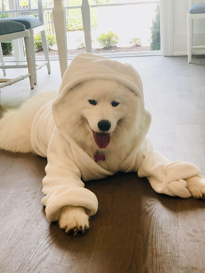 Zoe is not a polar bear, she’s a Samoyed pup. Mom Rebecca says Zoe loves to play dress up.