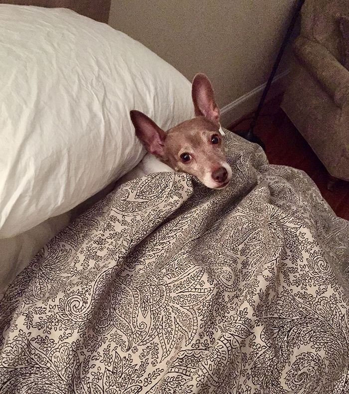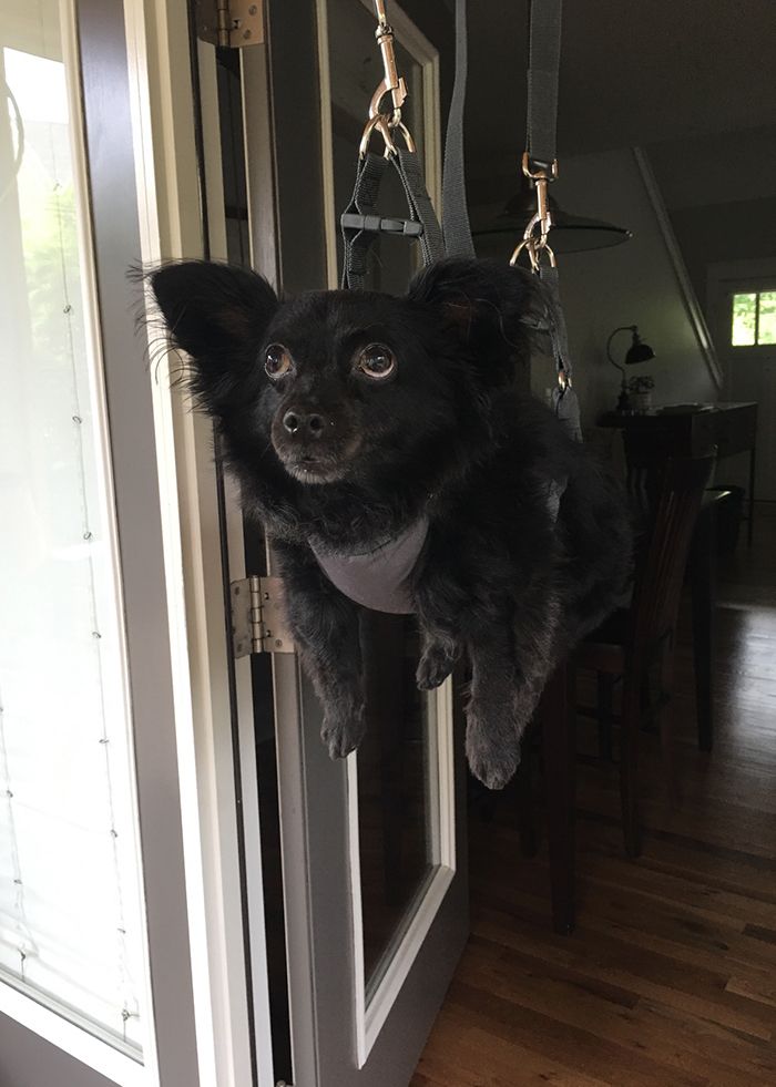 Olive is a Chiweenie and during quarantine, a groomer came to her house to trim her nails. “This is how she stabilized Olive to keep her still during the process. We could not stop laughing,” mom Julie says.