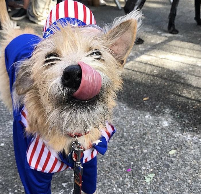 McKinley is dressed up in red, white, and blue for his Uncle Sam Halloween costume. He also has an Instagram account: @mckinleythepuppy.