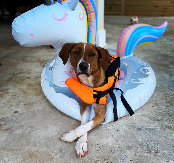 Swirly is a rescue pup adopted from the Humane Society. Her hobbies include “zoomie sprints, body slams, and naps,” mom Cindy says.