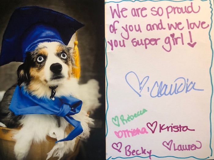 Emily gives all the credit to the veterinary team at Long Animal Hospital and Carolinas Veterinary Specialists. At Cookie’s last chemotherapy session, her medical team brought her out to the car in a graduation robe and cap.
