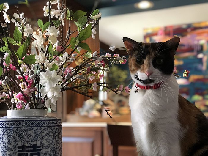 Felicity a big snuggle bug and likes to carry stuffed animals around the house and bring them to her humans. “Typical morning we wake up among a menagerie of two cats plus 4-5 stuffed animals that she has gifted us with during the night,” mom Christy says.