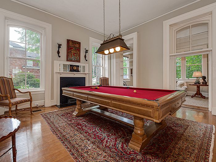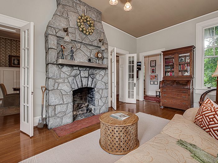 Old-school architecture: The Victorian house is known for its symmetrical layout, and well-preserved architectural details. Plastered walls, various decorative wallpaper patterns, oak fireplace surrounds, pocket doors and thick moldings speak to its craftsmanship.