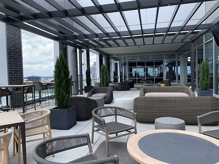 - Five outdoor patios including one on the rooftop with skyline and stadium views.