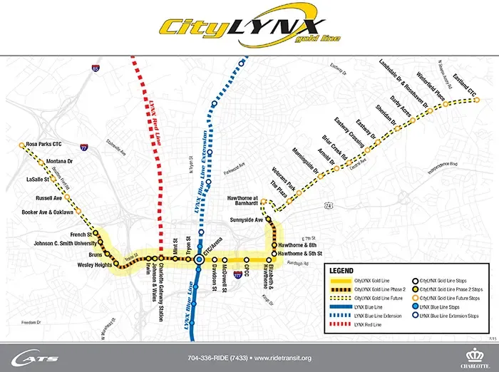 The original line, which opened in 2015, runs from Elizabeth to Uptown. The extension expands the current line west from Uptown to French Street, and east from Novant Health Presbyterian to Sunnyside Avenue in Plaza Midwood, for a total of 4 miles. The second phase added an additional 11 stops to the line.