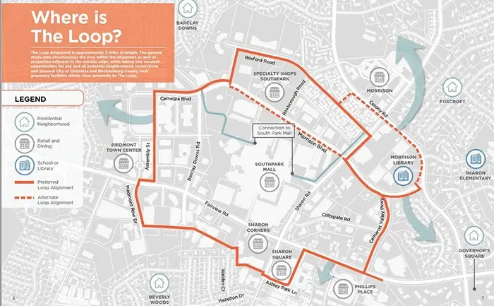 Zoom out: The loop is a biking and walking trail that’ll connect the majority of SouthPark’s commercial centers, from the mall to Phillips Place to Sharon Corners. Eventually, the path will have public gathering spots, plazas, public art and a variety of community activities.
