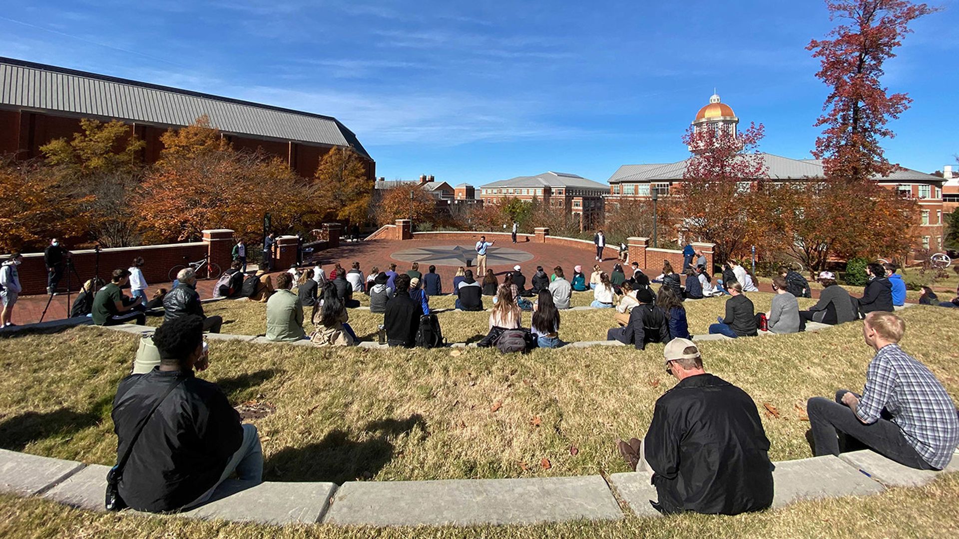 State Sen. Jeff Jackson (D) speaks to students in Star Quad at UNC Charlotte. Photo: Ashley Mahoney/Axios