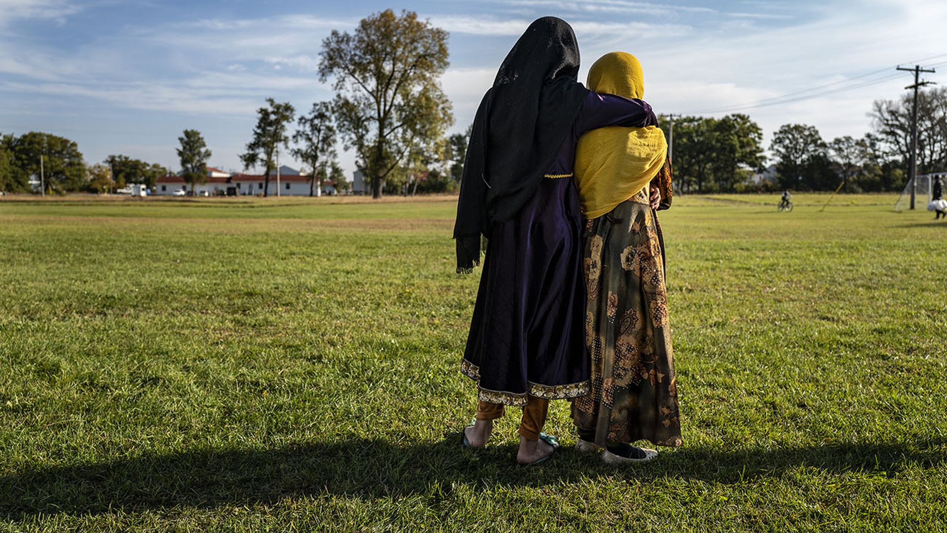 Afghan refugee girls watch a soccer game from a distance near the Village at the Ft. McCoy U.S. Army base in Ft. McCoy, Wisc., in September: Photo: Barbara Davidson/Pool Photo via AP, File