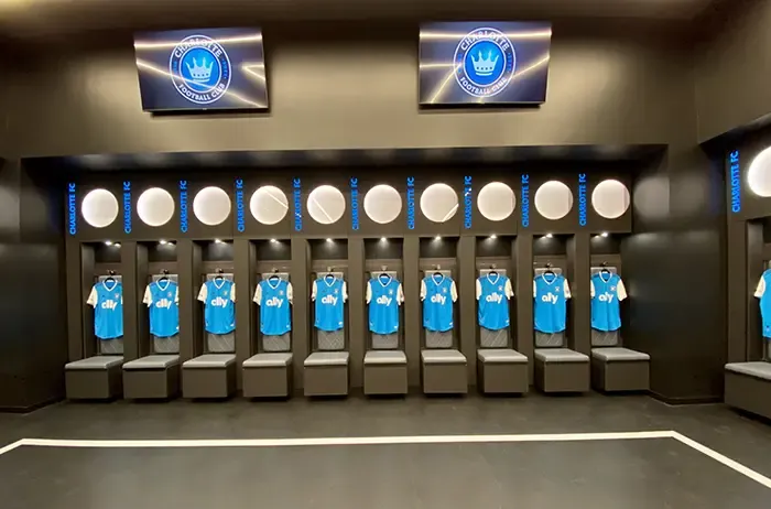- A 2,600-square-foot Charlotte FC locker room features a player entry corridor with suspended chandeliers; 30 player lockers with integrated back-lit logo, USB charging ports and embroidered locker seats, a glass coaching wall and eight high-definition screens. Adjacent to the locker room is the boot room as well as a restroom/shower area with spa finishes.