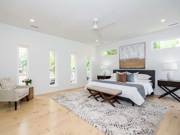 - Notable features: hardwood floors, double oven, minimalistic kitchen design, fireplace, shaded patio, stand-alone bathtub, and large bedroom space.