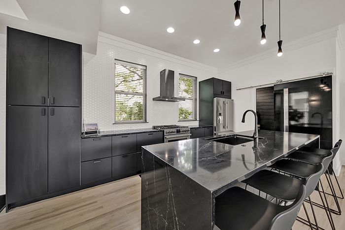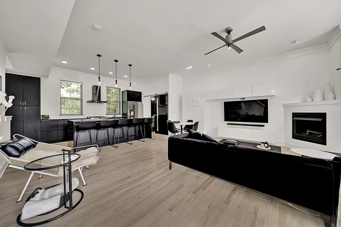 - Notable features: black kitchen cabinets, black marble kitchen island, built-in media center, two-car garage, and balcony.