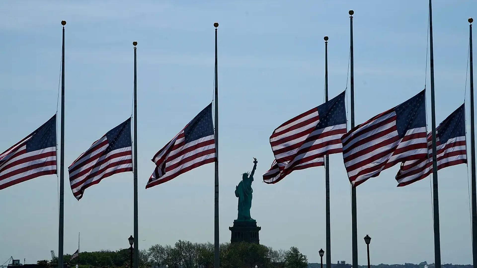 US flags fly at half-mast at Liberty State Park across the New York Bay from the Statue of Liberty on May 25, 2022, as a mark of respect for the victims of the May 24 shooting at Robb Elementary School in Uvalde, Texas. Photo: Timothy A. Clary/AFP via Getty Images