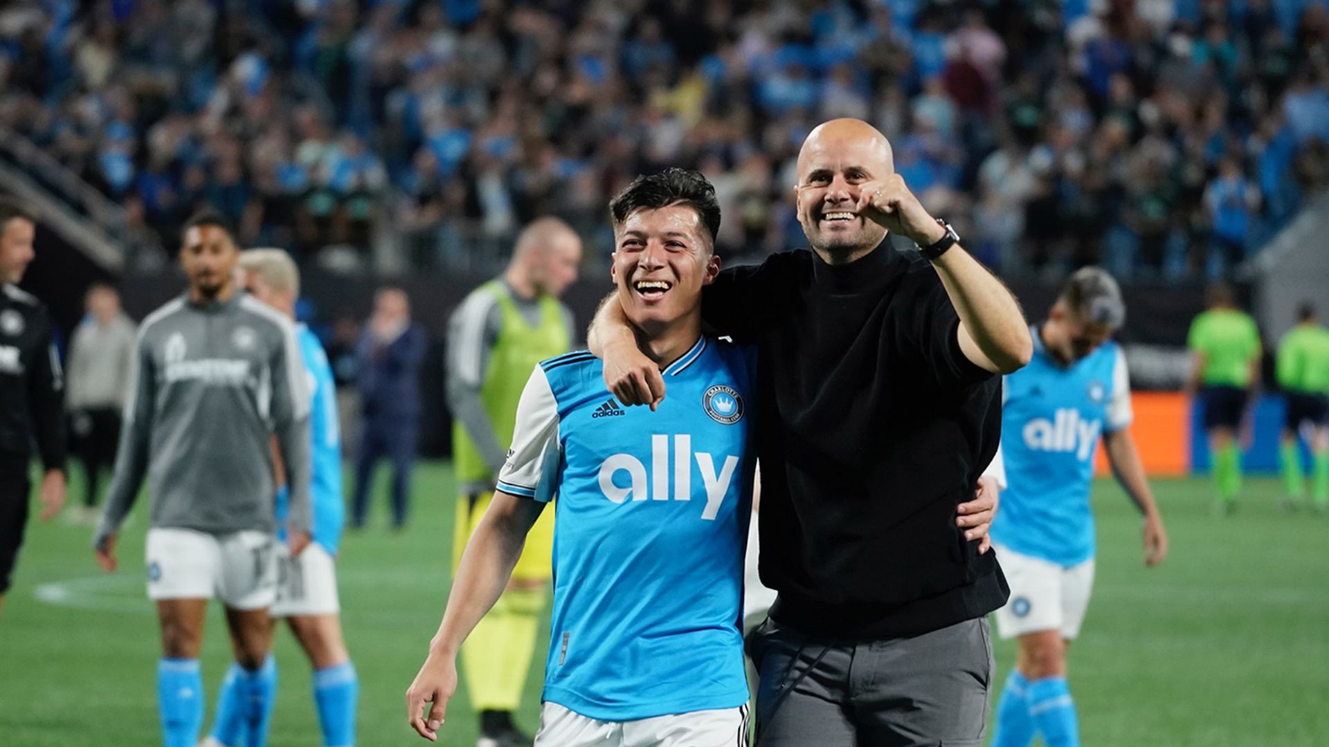 Charlotte FC midfielder Alan Franco (left) and head coach Miguel Ángel Ramírez celebrate after the club's first win in franchise history. Photo: Andy Weber/Axios