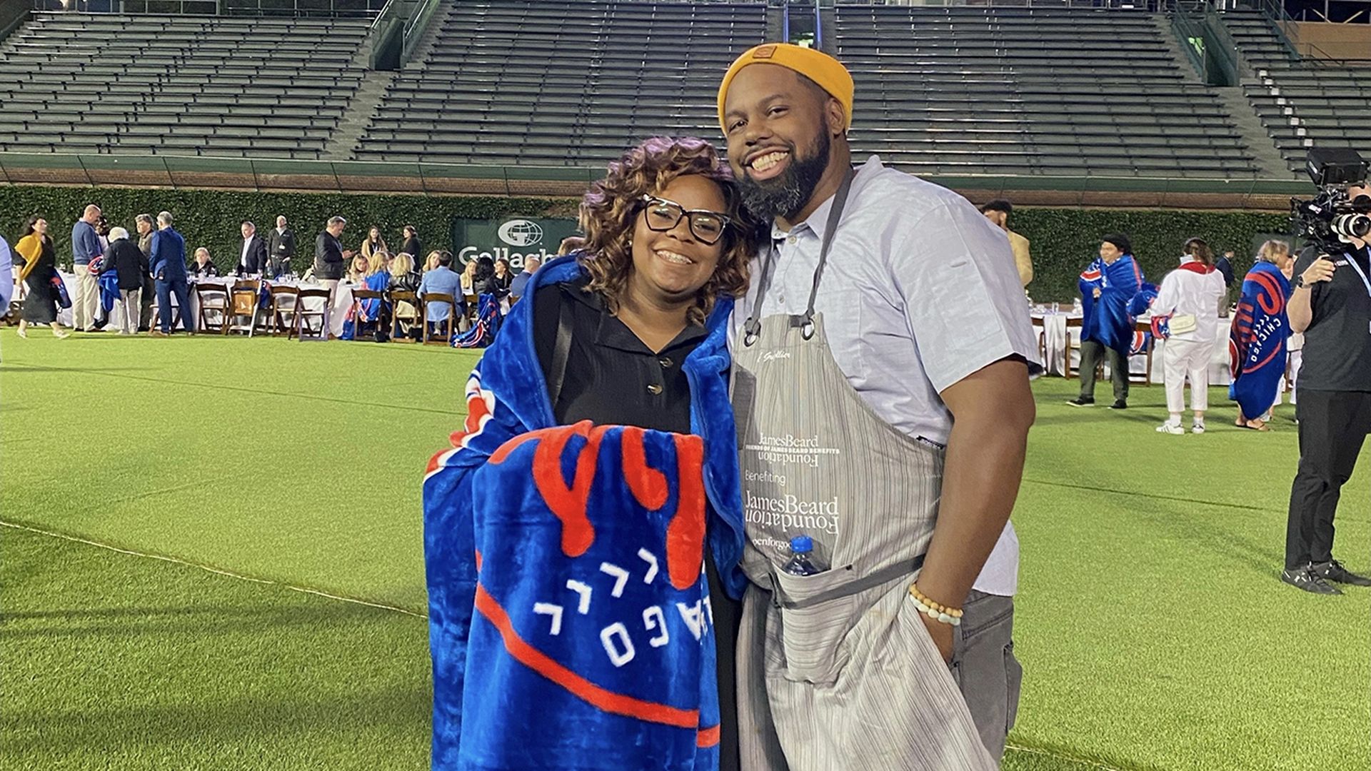 BayHaven Restaurant Group co-founders Subrina Collier and Chef Gregory Collier in the outfield of Wrigley Field after the inaugural Friends of James Beard Benefit Stadium Chef Series. Photo courtesy of Rachel Sutherland Communications