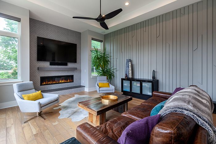 - Notable features: front and back patio, fireplace, vaulted ceiling, geometric floors, built-in shelving, wood-paneled walls, sunroom, quartz countertops and hot tub.