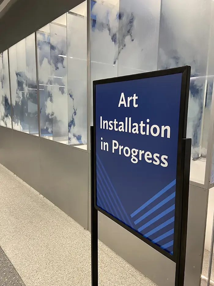 - “Restless Sky” by Catherine Widgery is currently being installed on the west subterranean walkway. As the name implies, it gives off the illusion of seeing the sky, despite being below ground.