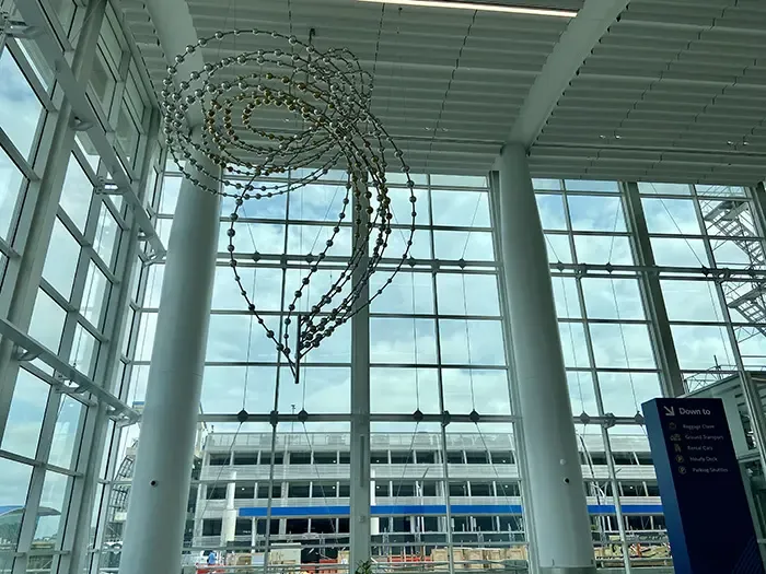 - “Meridian” by Danielle Roney is on the ticketing level before security. Its 569 spheres and 467 LED lights are meant to represent travel histories of Charlotteans.