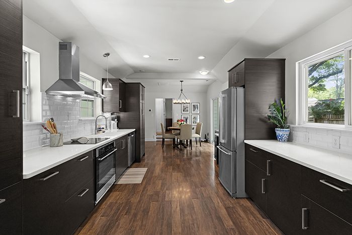 Why we love it: The dark colored kitchen cabinetry has a sleek design that adds a nice modern touch to this bungalow.