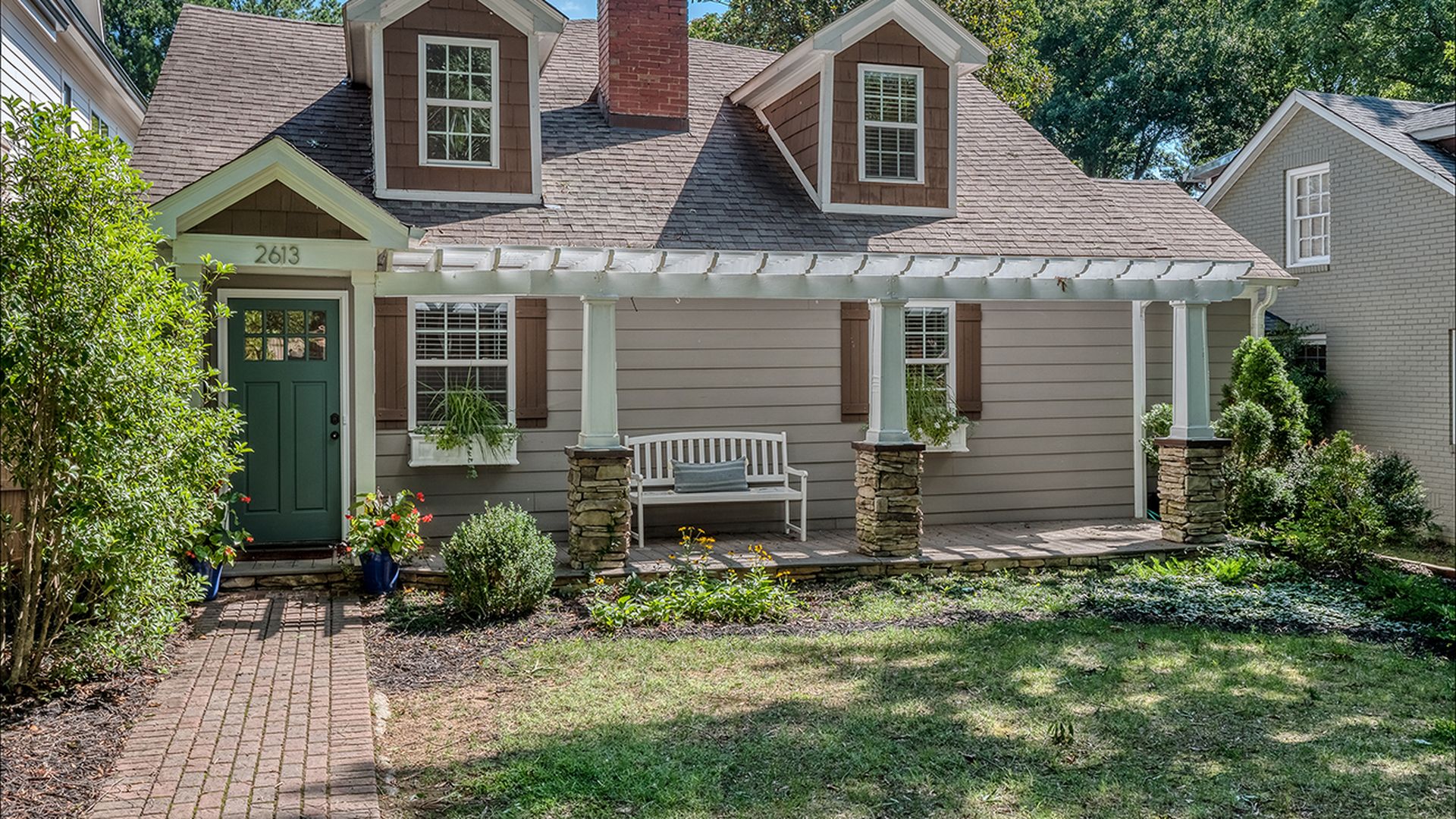 Why we love it: This bungalow has a large front porch pergola that makes this house distinctive.