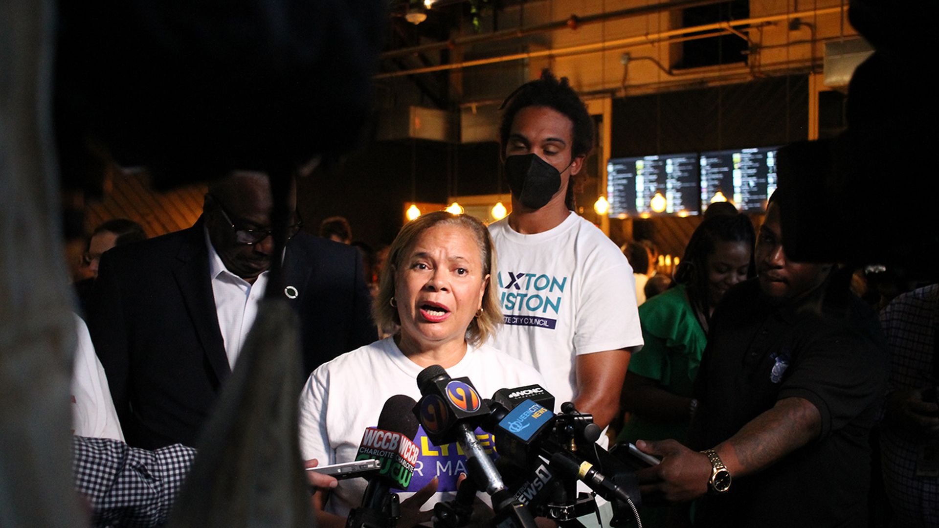 Mayor Vi Lyles speaks to reporters at the Democrat election watch party at Heist Brewery. Photo: Alexandria Sands/Axios