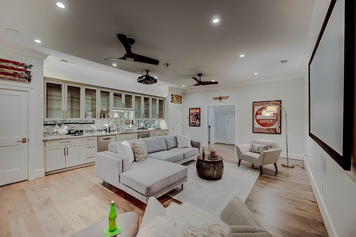 - Notable features: hardwood floors, modern light fixtures, marble kitchen countertops, vaulted ceilings, open layout, wine cooler, glass kitchen cabinets, fireplaces, free-standing tub, large walk-in closet, spacious movie room, wet bar, stone waterfall pool, three-car garage, shaded patio and fenced in backyard.