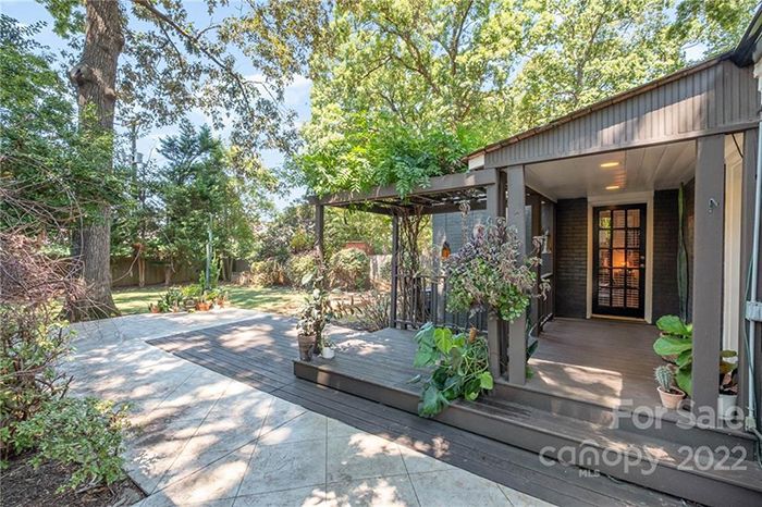 - Notable features: brick exterior, hardwood floors, fireplace, brick kitchen backsplash, spacious bedrooms, covered patio, vine-covered pergola, fenced-in backyard.