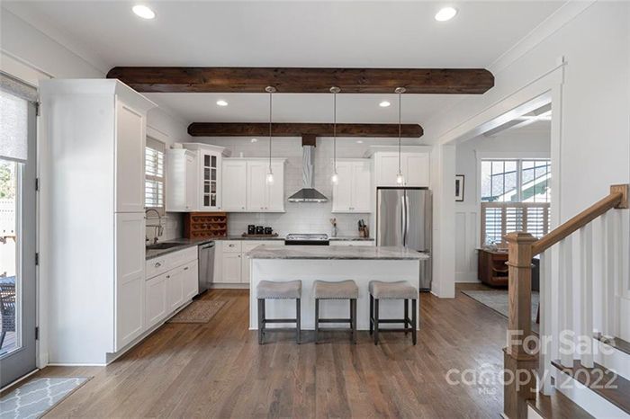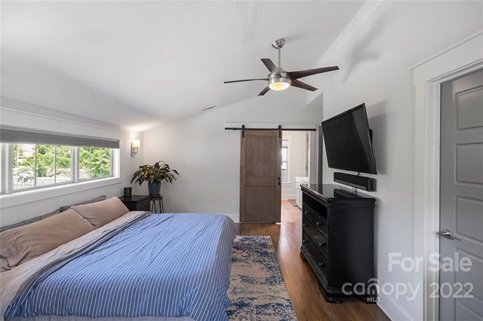 - Notable features: Large shaded front porch, hardwood floors, vaulted ceilings, sleek countertops, wooden plank ceiling in the kitchen, open kitchen layout, fireplace, sliding bedroom barn door, walk-in closet, spacious bathrooms, lifted deck and fenced-in backyard.