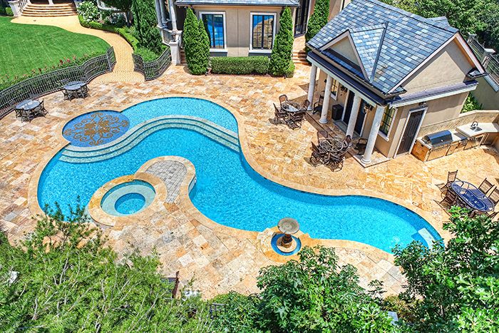 - A saltwater pool featuring glass tile imported from Spain, spa and fountain create a serene escape within the backyard.